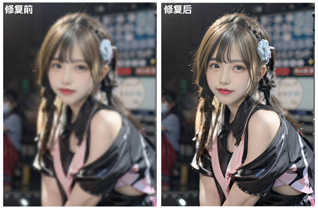 可以看一下修复效果,AI图像技术不仅可以将模糊图片中的人脸变清晰,还能根据原图还原五官与皮肤,变得更加具有质感。