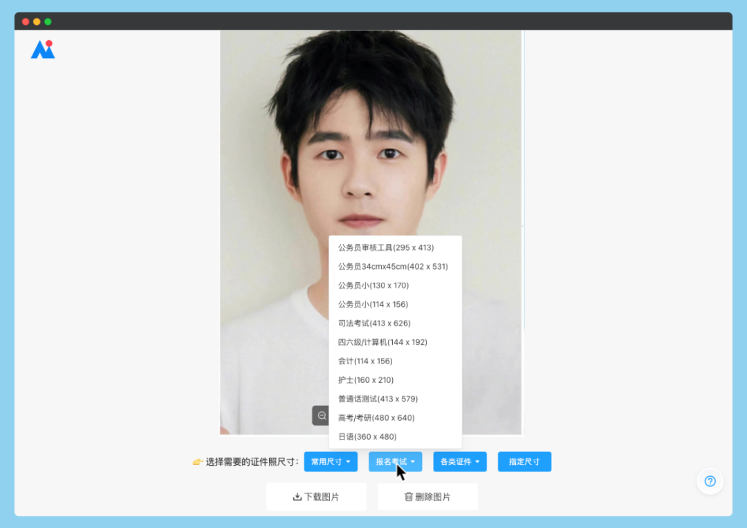 除了常用的证件照尺寸,这个网站还支持一键更换证件照背景,无论你需要红底蓝底、还是白底证件照,只需要一张照片就能统统搞定,不需要再去照相馆拍摄新的照片了😎。