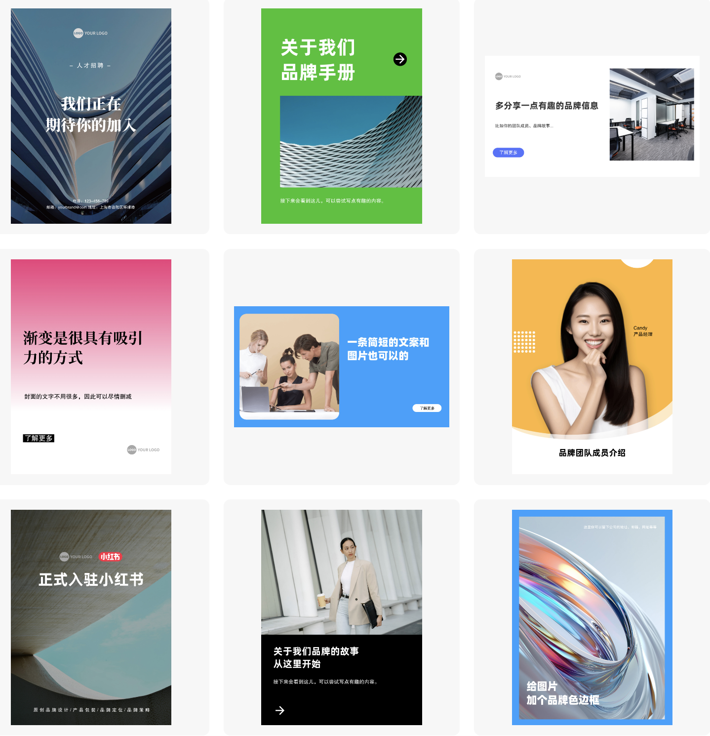 这里有从各大社交媒体里,精挑细选出品牌常用的话题,比如创始人简介,高点击量大的设计创意,比如渐变色封面,还有针对单个社交媒体常用的一些模板,比如新品牌入驻小红书通常会发一个,我们入驻小红书啦的类似图片。点击你喜欢的模板直接进行编辑,几分钟就能搞定一张社交媒体图片设计了。
