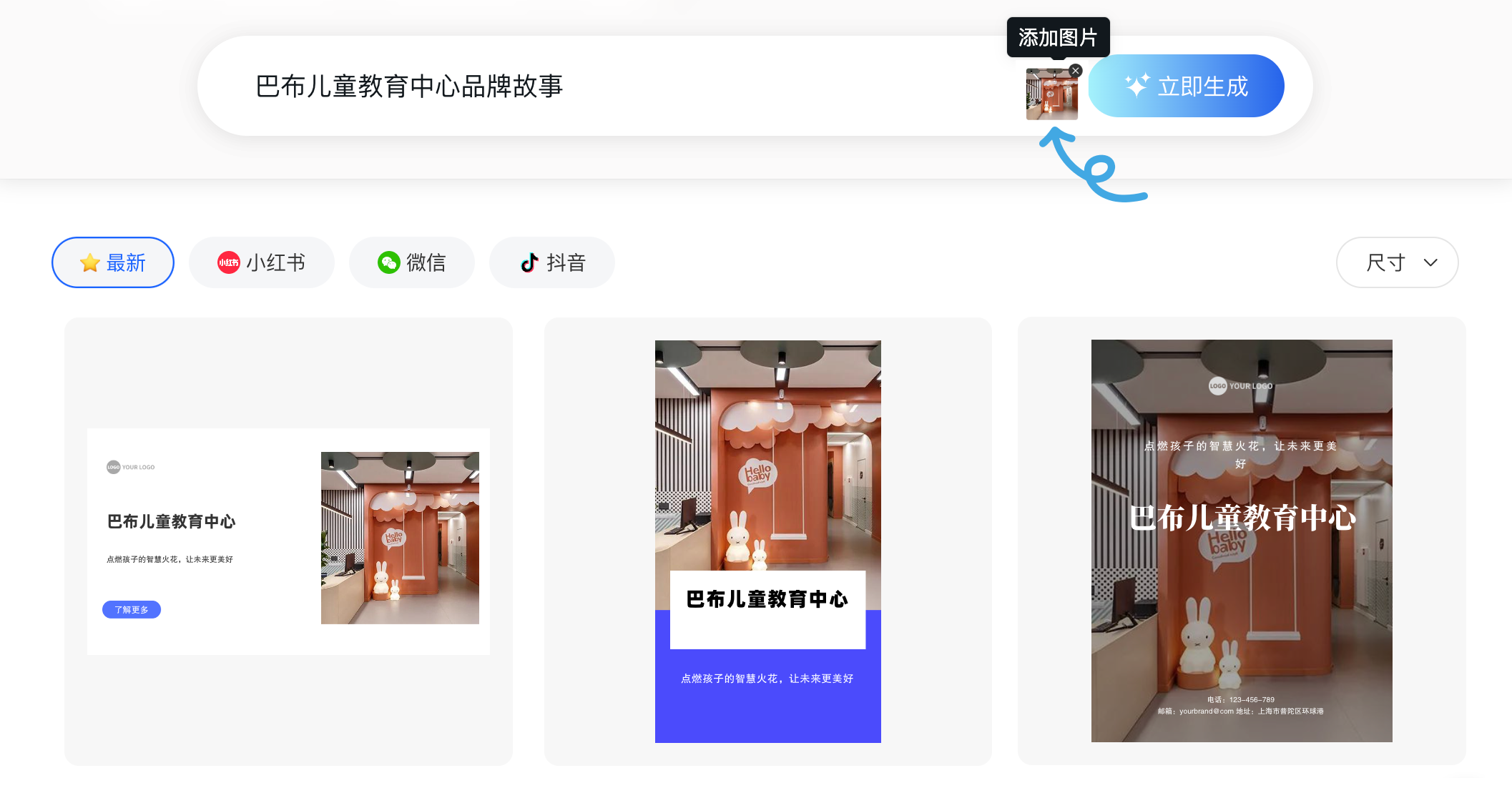 不管你是品牌主理人、创业者还是自媒体人,它最实用的点就在于只在文本框需要输入一句话,比如你的品牌名称或者品牌话题,AI就能一键帮你生成可以发布在不同社交平台的图片设计👇