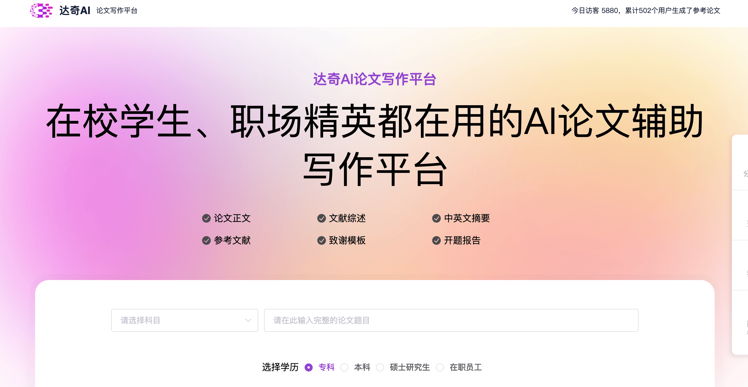 一款为在校学生、职场精英量身打造的AI论文辅助写作平台,为用户提供高效、智能的论文写作支持。达奇AI论文核心优势在于其强大的智能写作功能和丰富的学术资源。平台能够根据用户输入的选题方向和研究方向,自动生成免费论文大纲。