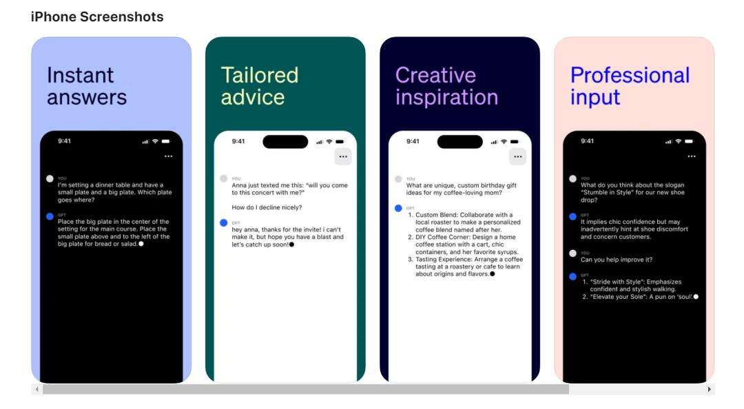 总体来看,iOS版ChatGPT的功能,基本与网页版的无异,比如即时问答、给出定制化建议、提供创作灵感、在生产力方面进行专业协助以及帮助用户学习语言、历史等内容。