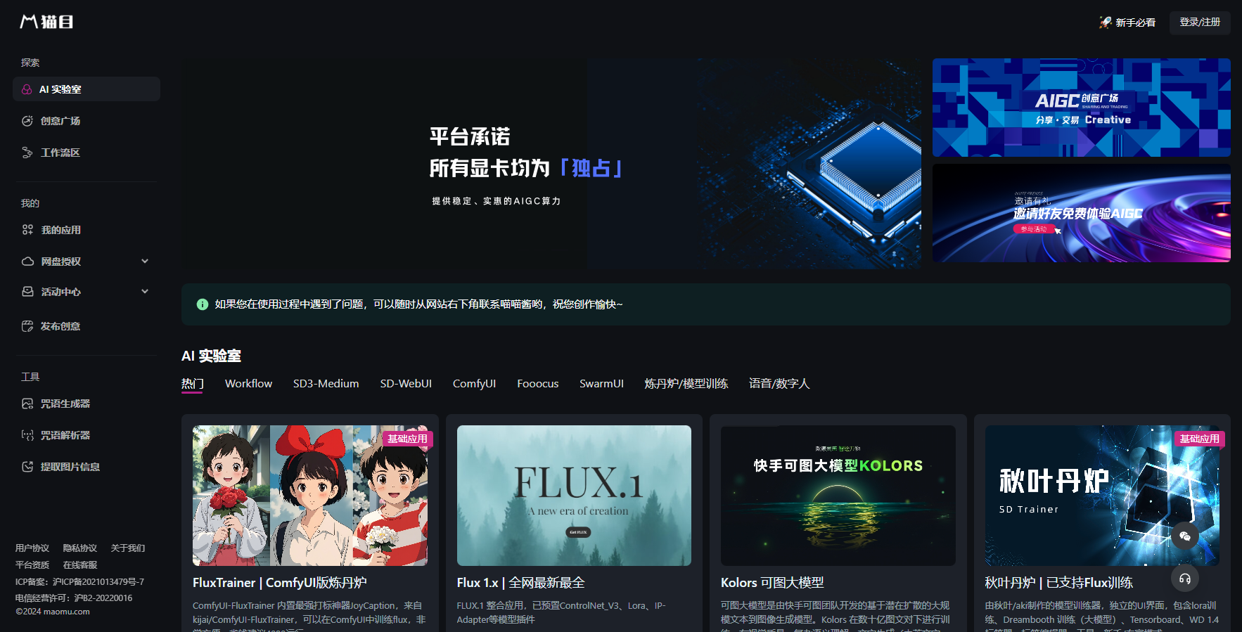 - 技术支持与简化操作:平台整合了大量计算资源,如上万张高端显卡,使得用户无需复杂的设置即可在线运行高级应用,大大提升了创作效率。