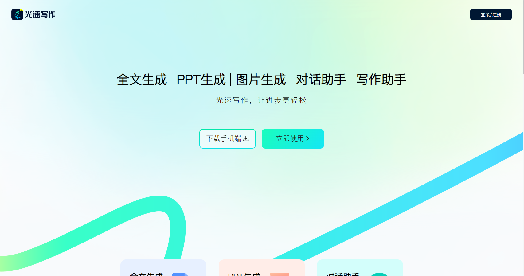 光速写作提供全文生成,大纲生成、文章改写、续写、扩写,AI问答,以及在各类根据您输入需求自动生成您需要的文本等AI功能。