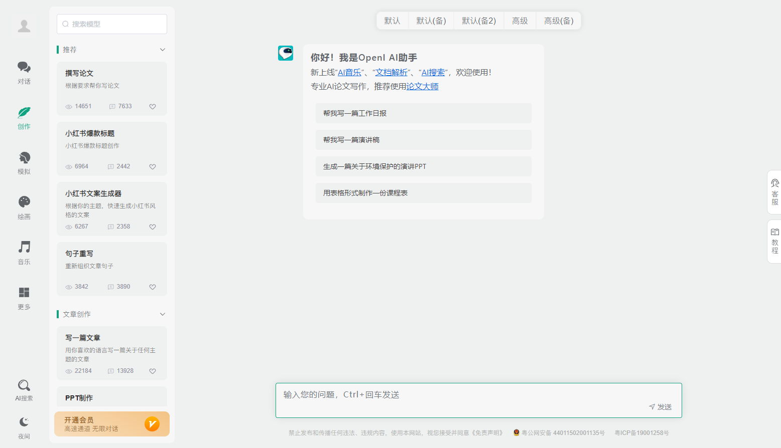 OpenI Ai助手目前为新用户免费提供 10 次基础模型(包括聊天、创作、角色)、2次绘画的使用机会;