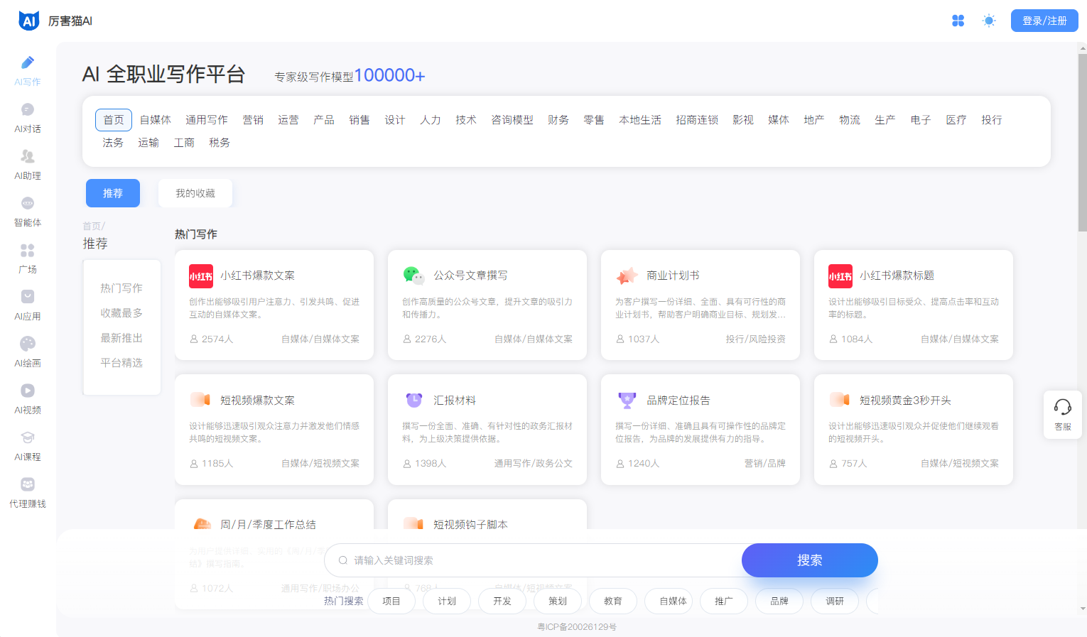厉害猫AI是一款在线AI写作平台,通过顶级的写作模型,满足不同行业的写作需求。厉害猫AI提供超100000种达到专家级别的AI职业写作模型,覆盖营销、技术、产品、运营、销售、人力、法务、教育、地产、直播、咨询、医疗、政务等30+领域,和100+高薪岗位的全场景写作需求。
