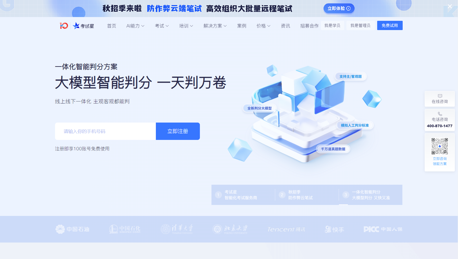 考试星是一个在线培训考试系统平台,专注于提供考试运营服务、命题判分等服务。它利用大模型智能判分、智能监考、AI出题等技术,为人才评定场景提供高效精准的数字化平台。