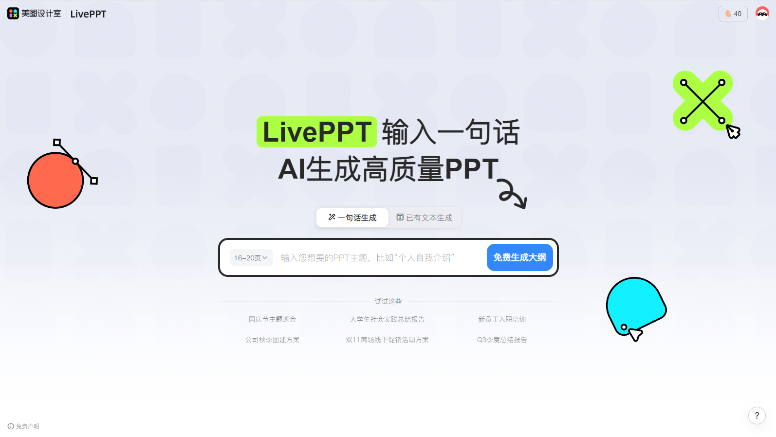 一句话生成PPT:用户只需输入一句话,系统即可自动生成PPT大纲和设计模板。