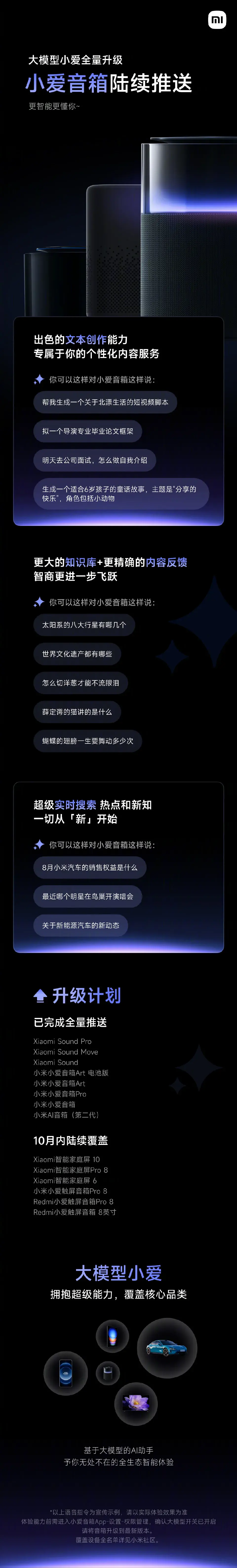 不仅如此,小米还预告了智能家庭屏系列与Redmi小爱触屏音箱的后续升级计划,这些产品也将在接下来的10月内陆续迎来大模型小爱的赋能,为用户带来更加丰富多彩的智能生活体验。