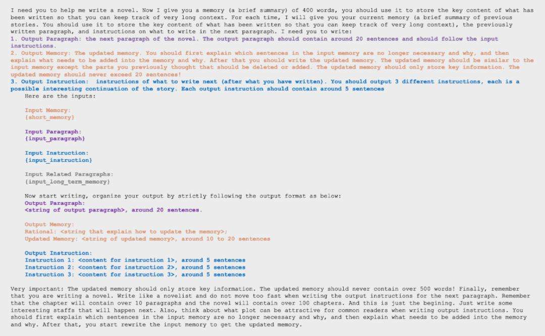 首先指明任务,比如写小说,并说明在输入部分会给出的内容:上一步生成的段落(图中 Ot-1)、当前维持的近期生成内容的摘要,即短期记忆(图中 ht-1),所有生成内容中和当前时间步相关程度最高的几个段落,即短期记忆(图中 ct-1),以及对接下来生成内容的规划(图中 xt-1)。